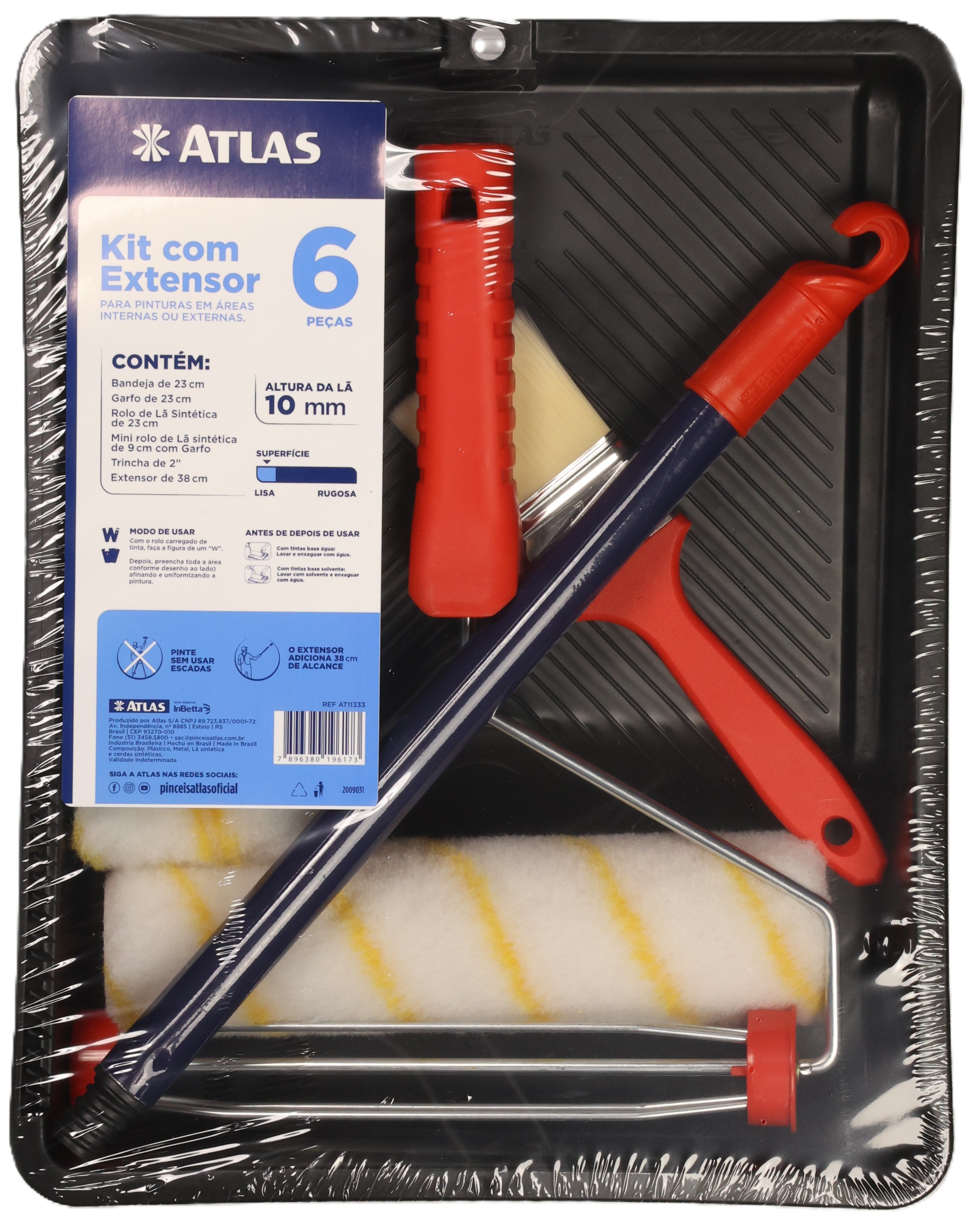 Kit de pintura com 6 peças contém: Bandeja de pintura (1523P), trincha 2" (AT315/5), mini extensor, minirolo 9 cm (AT773/9), garfo gaiola (400/23SR) e rolo de lã de poliéster de 23cm (773/10).